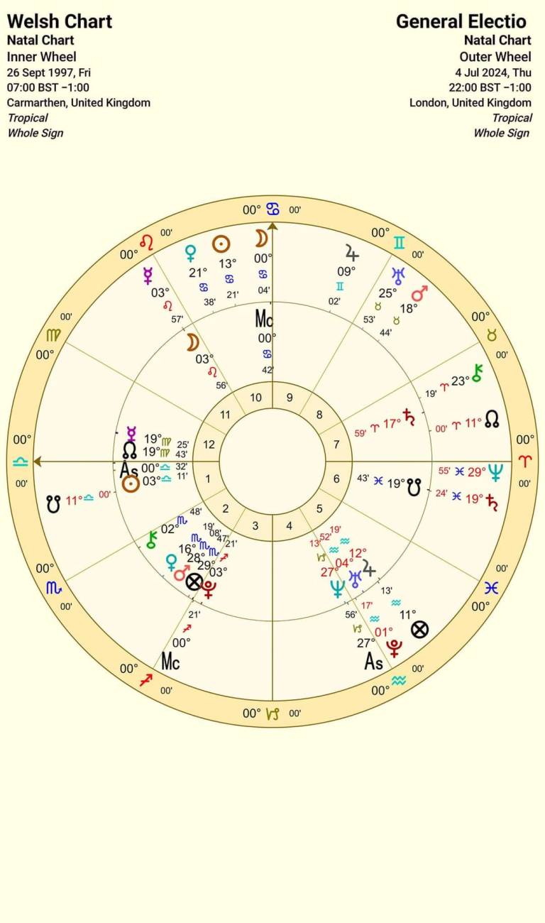 I am using whole signs and Hellenistic astrological principles here. The reason is that I am convinced after much reading that, as Hellenistic astrology is more predictive and collective and world-centred, it offers some fascinating political speculations. The works of both Vettius Valens and Firmicus Maternus are more suited for the General Election of July 2024 and the world of late capitalism. Psychological astrology offers many insights into the psyche of both Starmer and Sunak, and in the future, I will allude to what we may learn from them and psychological astrology.